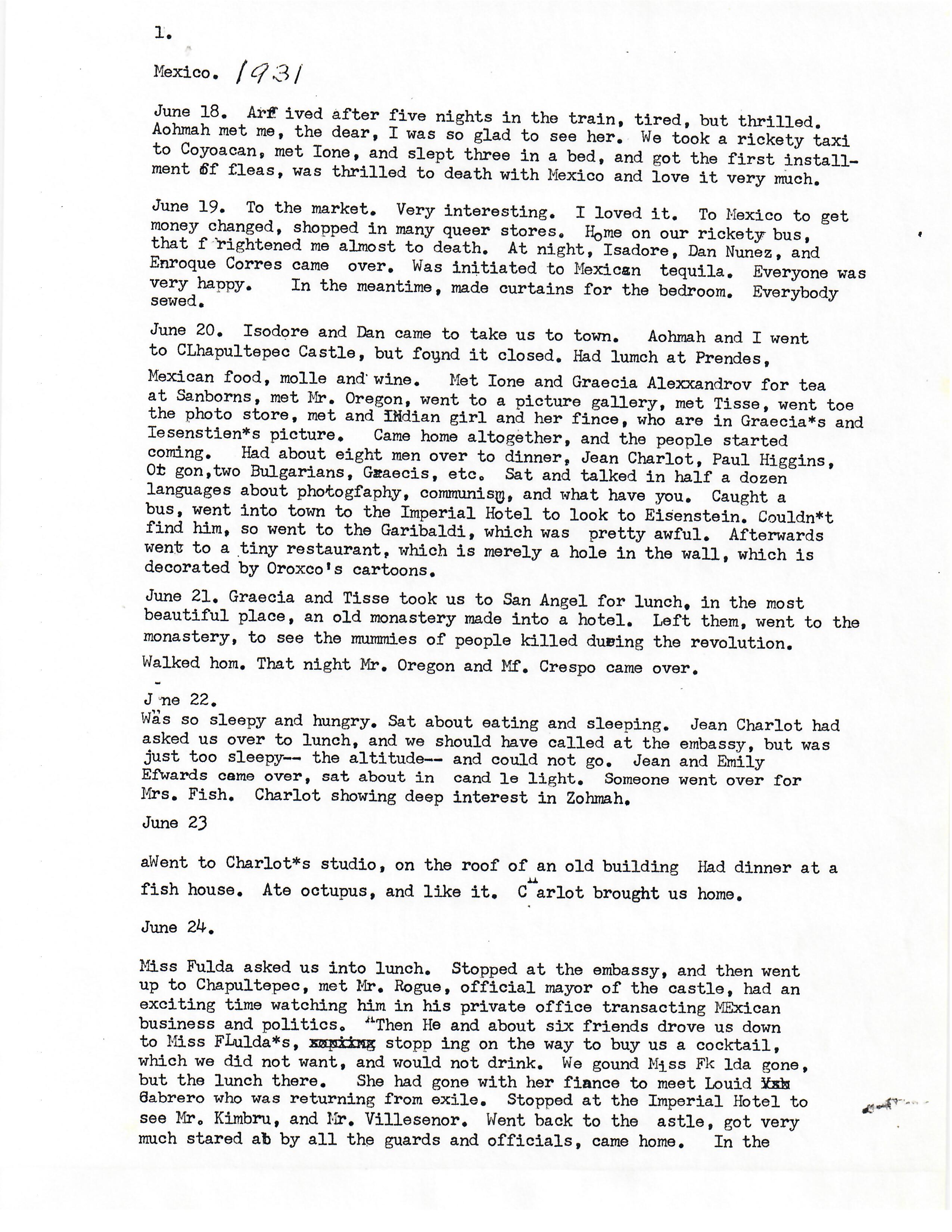 1931 diary, page 1. Berta Day. June 18–August 16, 1931. Mexico. Transcribed by Berta Day in 1981. Nine pages.